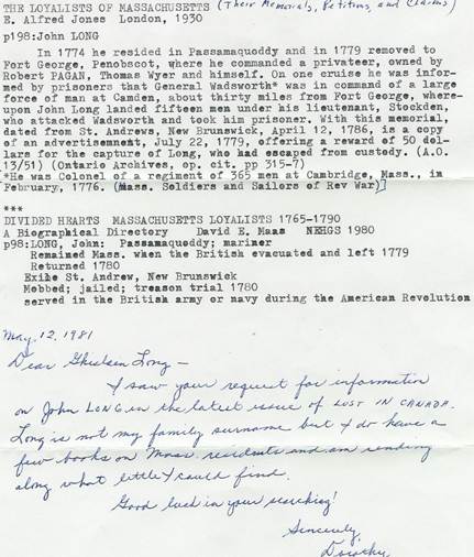Esther Clark Wright ouvre son livre avec le titre suivant : « Chapitre 1 – De loyaliste à tory ». Les premières phrases qui suivent auraient tout aussi bien pu être écrites pour Philip Long. « Il était connu pour sa loyauté envers son roi en 1775. Ces mots sont gravés sur la grande pierre qui recouvre la sépulture de Thomas Gilbert, originaire de Taunton, au Massachusetts, dans le cimetière de Gagetown, au Nouveau-Brunswick. Ils ont probablement été gravés des centaines de fois dans les cimetières le long du fleuve Saint-Jean, et dans d’autres régions du Nouveau-Brunswick. En résumé, ils racontent des années de suspicion et de division croissantes, des années de persécution active, d’exil, d’emprisonnement, de perte de biens, de proscription et de condamnation. […] Les loyalistes ont été vilipendés par ceux qui ont renié leur allégeance au roi; ils ont parfois été encensés avec un orgueil fanatique par leurs descendants… »[ii]