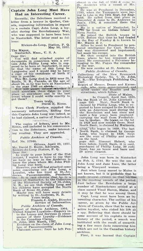 Figure 8 – Article sur le capitaine John Long dans une publication intitulée The Selectmen, 1937. Il le confondait avec Philip Long.