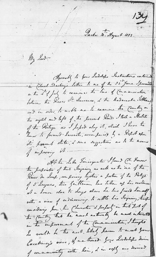 Lettre d’Alexander Fraser au colonel Darling, datée du 25 septembre 1823, à Québec.[xix]
