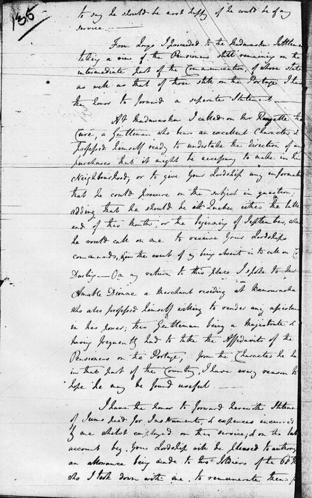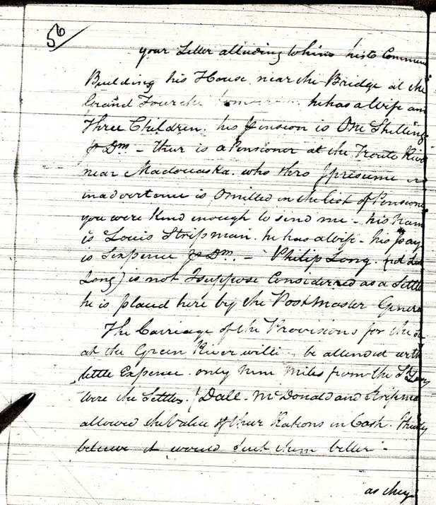 William Clifford était ici mercredi. J’ai lu le paragraphe de votre lettre l’autorisant à commencer la construction de sa maison près du pont de la Grande Fourche demain. Il a une femme et trois enfants. Sa pension est d’un shilling par mois. Il y a un pensionné à la rivière Trout, près de Madawaska, qui, je suppose par inadvertance, a été omis de la liste des pensionnés que vous avez eu l’amabilité de m’envoyer. Il s’appelle Louis Stripman. Il a une femme. Sa solde est de six pence par mois. Philip Long (et non Luke Long) n’est, je suppose, pas considéré comme un colon. Il est placé ici par le directeur général des postes.