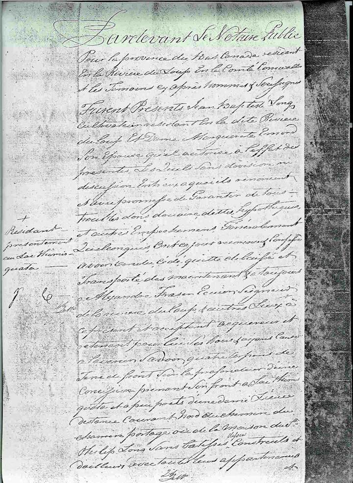 L’acte de vente des terres entre Philip Long, Alexander Fraser et Joseph Bouchette est donc d’une grande importance historique pour notre famille.