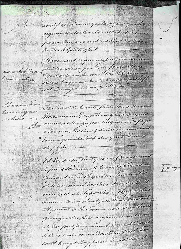 La Sus dite vente faite Sans aucune Réserves ni Exception quelconques mais à charge par l’acquéreur de payeur à l’avenir, les Cens & droits Seigneuriaux Envers qui ils sont dus (les quatre derniers mots sont rayés) quitte de ceux du pape.