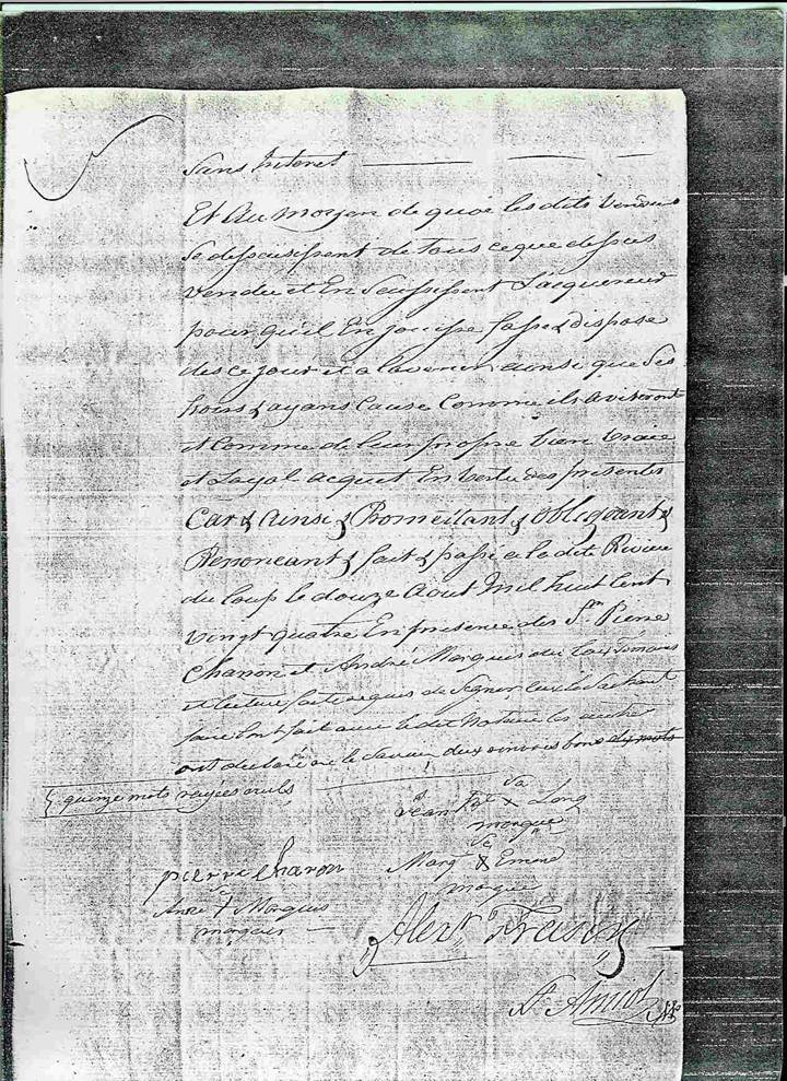 Et Au moyen de quoi les dits vendeurs Se défsaisifsant de tous ce que depuis vendu et En Saifsifsent L’acquéreur pour qu’il En jouifse fafse & dispose dès ce jour et a l’avenir ainsi que Ses avoirs & ayans causes comme ils aviseront et comme de leur propre bien vraie et Loyal acquet En Vertu des présentes Car & ainsi & Promettant & obligeant & Renoncant & fait & pafsé a la dite Rivière du loup le douze Août Mil huit Cent vingt quatre En présence des Sieurs Pierre Charon et André Marquis du Lac Simon et lecture faite requis de Signer eux Le Sachant faire & ont fait auci Le dit Notaire les autres ont déclaré ne le savoir deux renvois bons dix mots (ces deux mots sont rayés) quinze mots rayés nuls