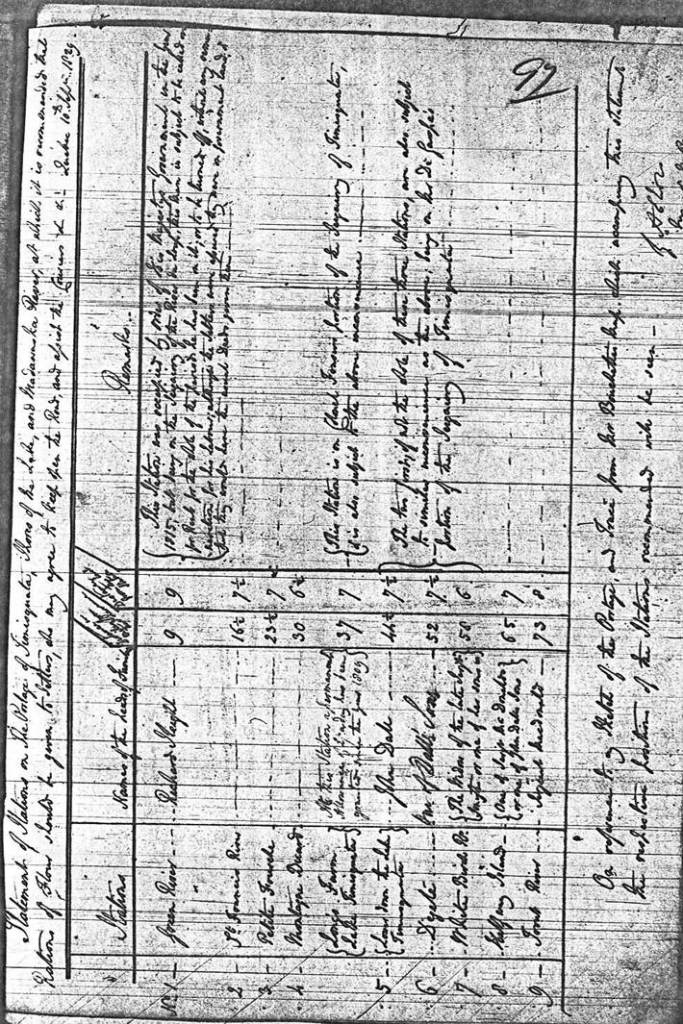 Énoncé des postes de ravitaillement sur le portage de Temisquata, à l’extrémité du lac et sur la rivière Madawaska, où il est recommandé de distribuer des rations de farine aux colons, qui pourraient accepter de maintenir la route ouverte et d’empêcher les courriers. Québec, 10 septembre 1829 Numéro des stations Noms des chefs de famille Distance en milles de La Savane Distance de la dernière station 1 Green River Richard (?) 9 9 2 St. Francis River – – – – – – – – – – – – – – – – – – 16 ½ 7 ½ 3 Petite Fourche – – – – – – – – – – – – – – – – – – 23 ½ 7 4 Montagne Buard – – – – – – – – – – – – – – – – – – 30 6 ½ Long’s Farm Lake Temisquata À cette station, une allocation permanente de 2 shillings. Un jour a été accordé depuis l’an 1809 37 7 5 Bas (?) le lac Témisquata John Dall 44 ½ 7 ½ 6 Dégelé Un des fils de Dall 52 7 ½ 7 Rivière White Bird La veuve de feu (?) Smyth ou un de ses fils 56 6 8 Île (?) Fils de (?) McDonald ou un des fils de John Dall 65 7 9 Rivière Trout (?) McDonald 73 8 En référence à mon croquis du portage et au tracé de la carte de M. Bouchette qui accompagnent cette déclaration des positions respectives des stations recommandées, on pourra voir. G. A. Eliot Numéro Stations Remarques 1 Rivière Green Cette station a été occupée sur ordre du gouvernement de Sa Majesté en l’an 1815; Mais comme il se trouve sur la seigneurie de la rivière du Loup, cet homme peut être sommé de payer un loyer pour toute la période où il y a séjourné, ou être expulsé sans aucune rémunération pour son travail. Bien que les colons aient été assurés qu’ils se trouvaient sur des terres gouvernementales, j’imagine qu’ils ont pu obtenir les concessions habituelles. 4. Ferme Long. Cette station se trouve sur la portion de la seigneurie de Témisquata appartenant au colonel Fraser ; elle est également soumise aux inconvénients mentionnés ci-dessus. 5. 6. 7. Lac Témisquata inférieur. Dégelé. Rivière White Bird. Les deux premières, sinon la totalité de ces trois stations, sont également soumises aux mêmes inconvénients que celles mentionnées ci-dessus, étant situées sur la portion de la seigneurie de Témisquata appartenant à la famille De Gaspé.
