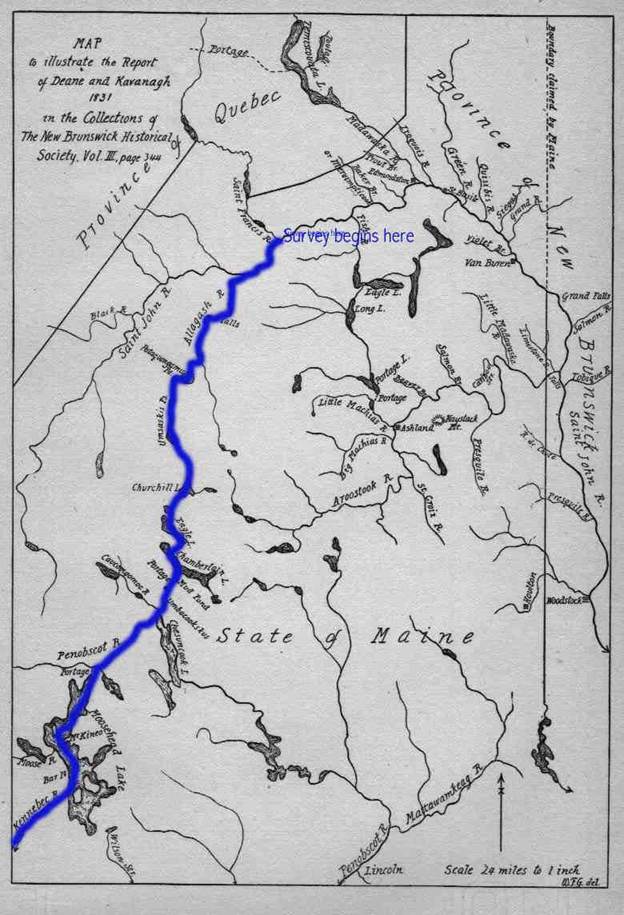 Figure 150 – Carte illustrant le rapport de Deane et Kavanagh – 1831 – Source : Upper St-John ; Source originale : Raymond …