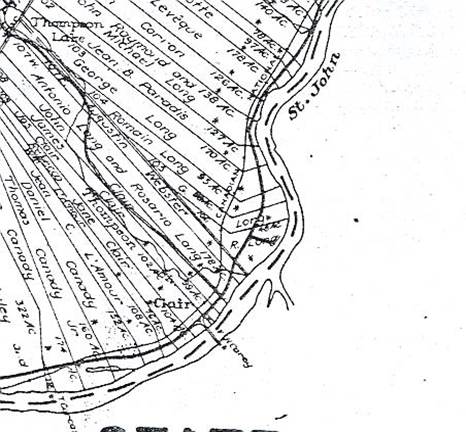 Figure 154 – Carte mise à jour au milieu des années 1950 des concessions originales des premiers colons à Clair, Nouveau-Brunswick – 1848