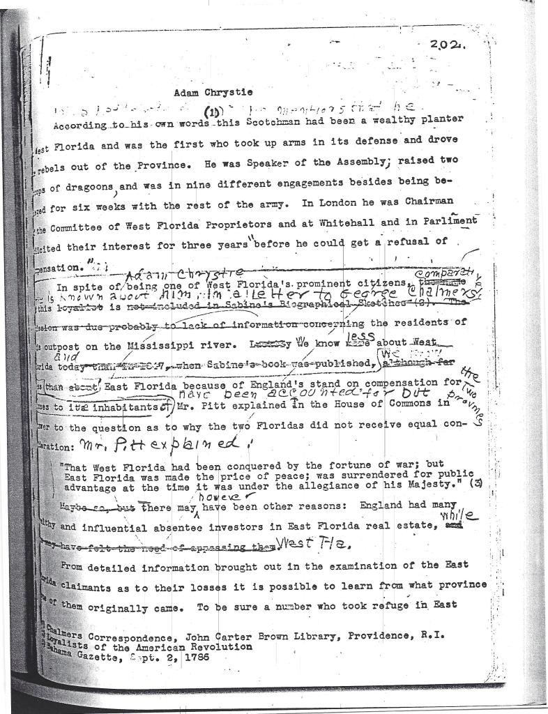 Adam Chrystie – un document intéressant sur la vie de Adam Chrystie, loyaliste Ecossais, et son rôle dans la communauté de West Florida