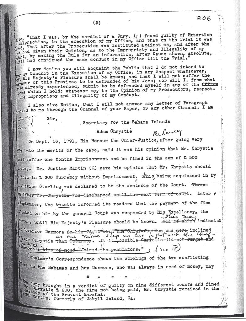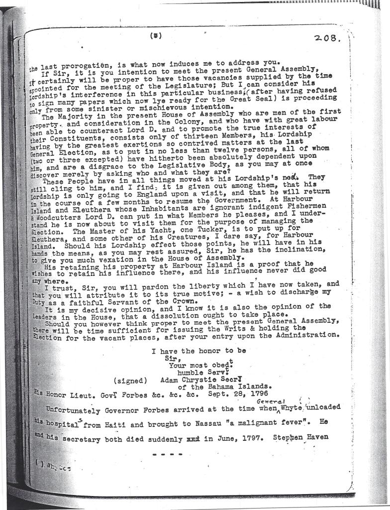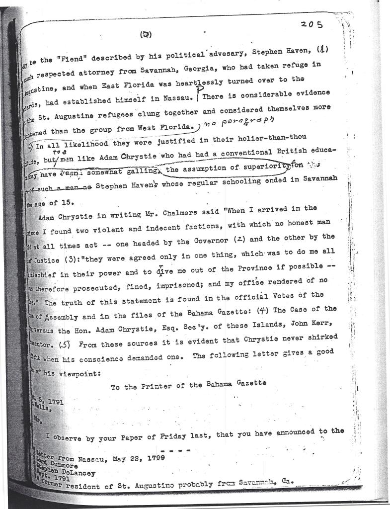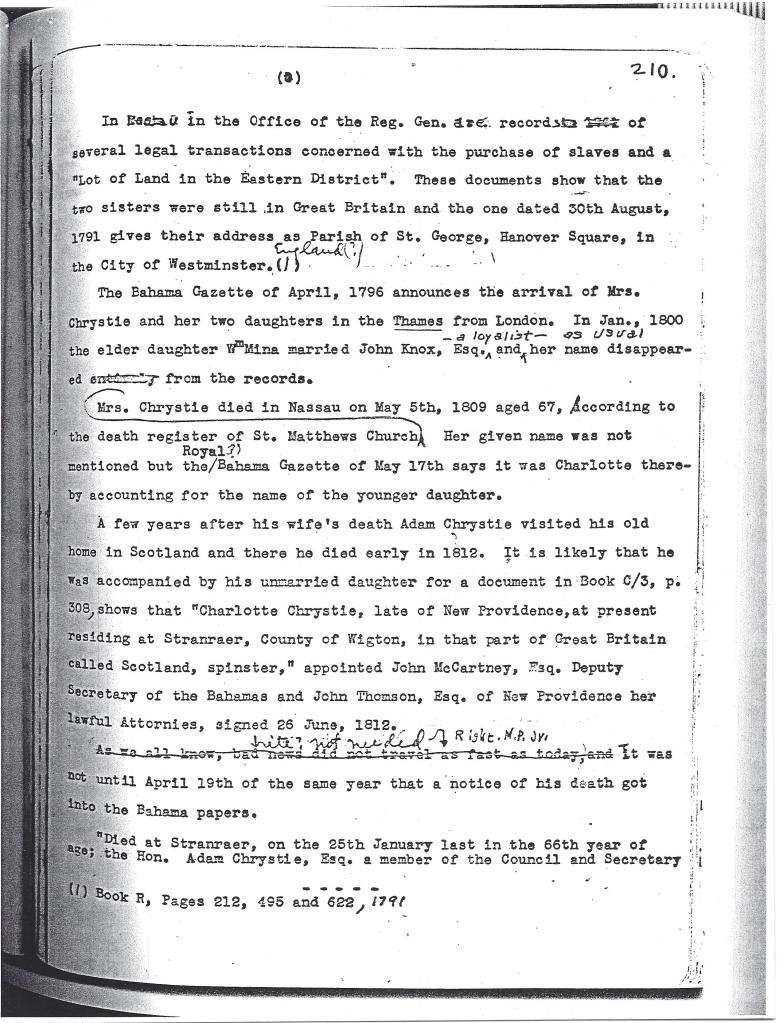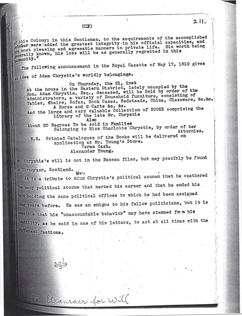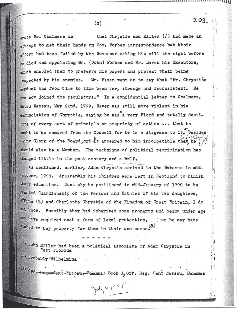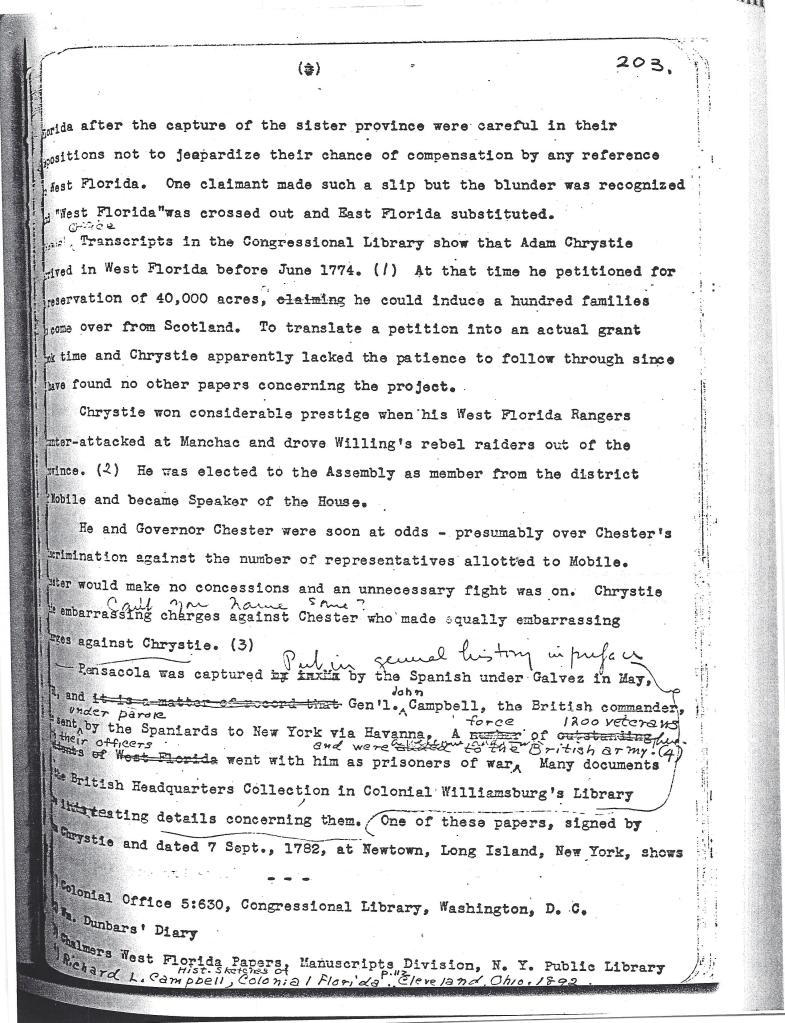 [Note : Le nom d’Adam Chrystie apparaît sur une pétition de Pensacola datée d’« après 1778 » et intitulée PÉTITION DES HABITANTS DE LA FLORIDE OCCIDENTALE BRITANNIQUE. (Source : http://vidas.rootsweb.com/bripet.html). Ce document fascinant montre que Chrystie était déjà un résident important de la Floride occidentale britannique au début de la Révolution.] À ce jour, nous n’avons pas encore trouvé d’autres preuves de la présence de Chrystie en Floride occidentale.