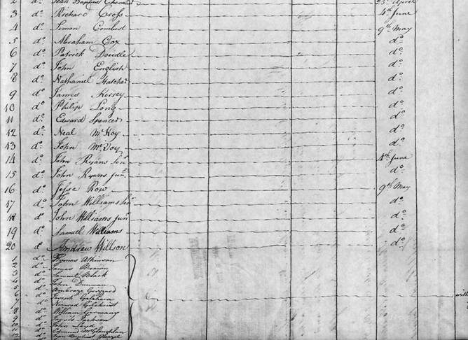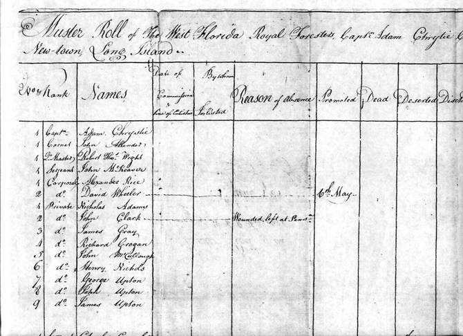 Le soldat Phillip Long, de la WFRF, aurait quitté la compagnie du capitaine Adam Chrystie le 9 mai 1781 ou avant. L’appel a été effectué à New Town, Long Island, New York, le 24 juin 1781.