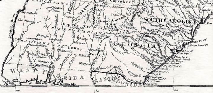 La distance entre Pensacola et Savannah est de plus de 500 kilomètres. Le terrain est accidenté et couvert de forêts vierges. Au printemps 1781, notre ancêtre traversait une région sauvage et des territoires indiens – les nations Cherokee et Creek – situés entre ces deux villes. La voie maritime habituelle entre ces deux ports était la bateau, un voyage d’une semaine dans des conditions idéales. À pied ou à cheval, il aurait fallu au moins trois à quatre semaines de marche sans interruption pour atteindre Savannah depuis Pensacola. Mais nos ancêtres ont marché – en fait, ils ont tout fait à pied – ou ont utilisé des chevaux pour atteindre leur destination.
